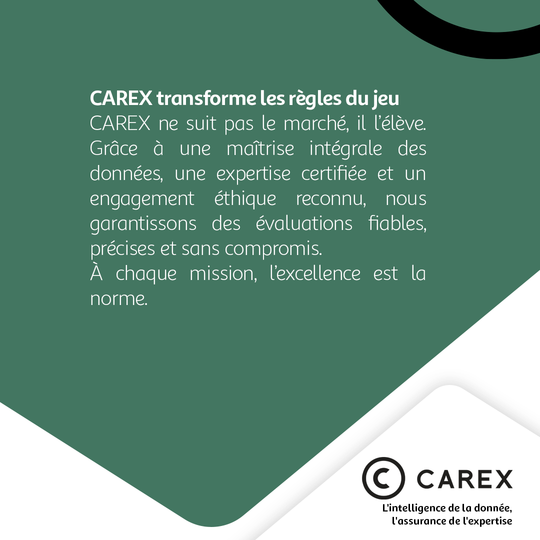 CAREX ne suit pas le marché mais le transforme. Notre atout ? Une parfaite maîtrise des données, depuis leur collecte brute jusqu'à leur enrichissement intelligent, pour des analyses précises, solides et incontestables. Pas d'à-peu-près, pas de délégation : chaque expertise repose sur un savoir-faire aiguisé, constamment alimenté par la formation continue de nos équipes et notre implication active dans les communautés professionnelles de référence.