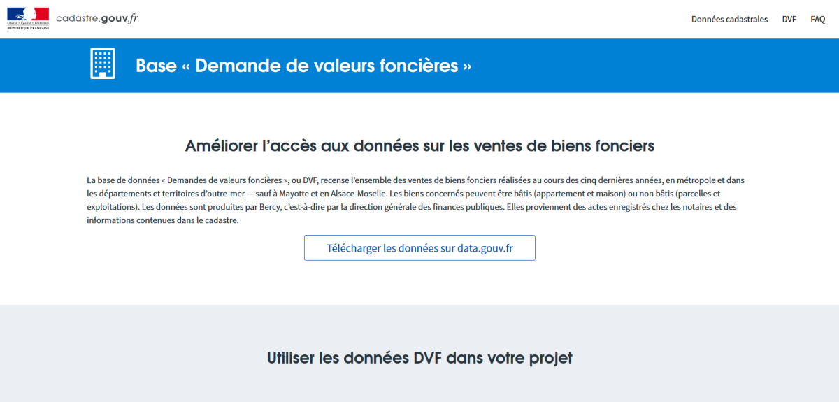 DGFip annonce l’ouverture de la base "Demande de valeurs foncières" (DVF), mettant à disposition les principales informations déclarées à l’occasion des mutations immobilières (ventes, adjudications, ...) sans conditions d’accès.